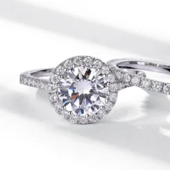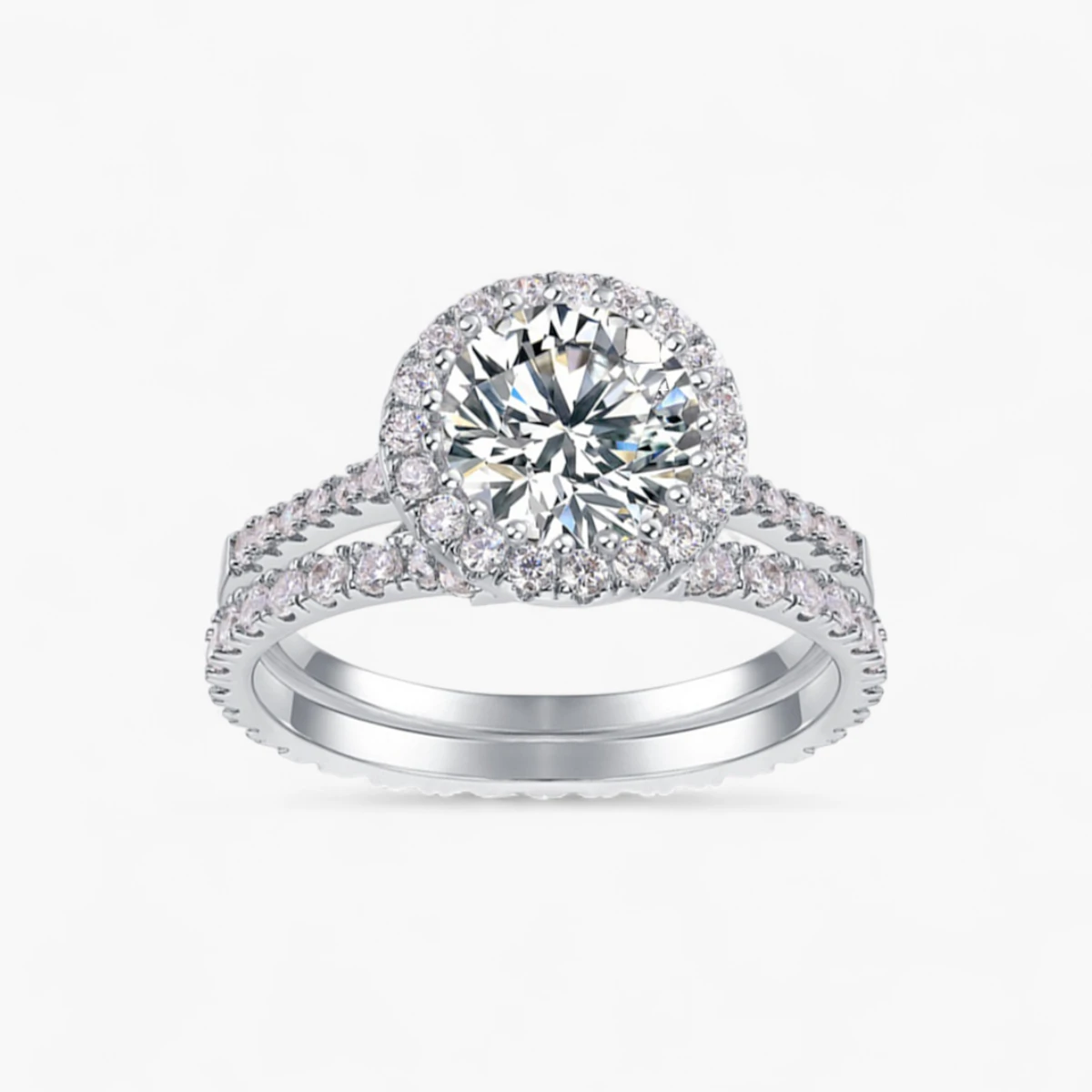 This exquisite 1.76ct round moissanite halo stackable ring set artfully combines classic and modern design elements. The set includes a stunning 1.76ct moissanite halo ring paired with a delicate eternity band, with the central moissanite surrounded by a sparkling halo that radiates luxury and brilliance in every light. The stackable design adds visual depth and a touch of modern style, allowing the rings to be worn individually or together for a unique look. Crafted from high-quality sterling silver, these rings feature exceptional craftsmanship and fine polish, making them the perfect choice to symbolize enduring love.