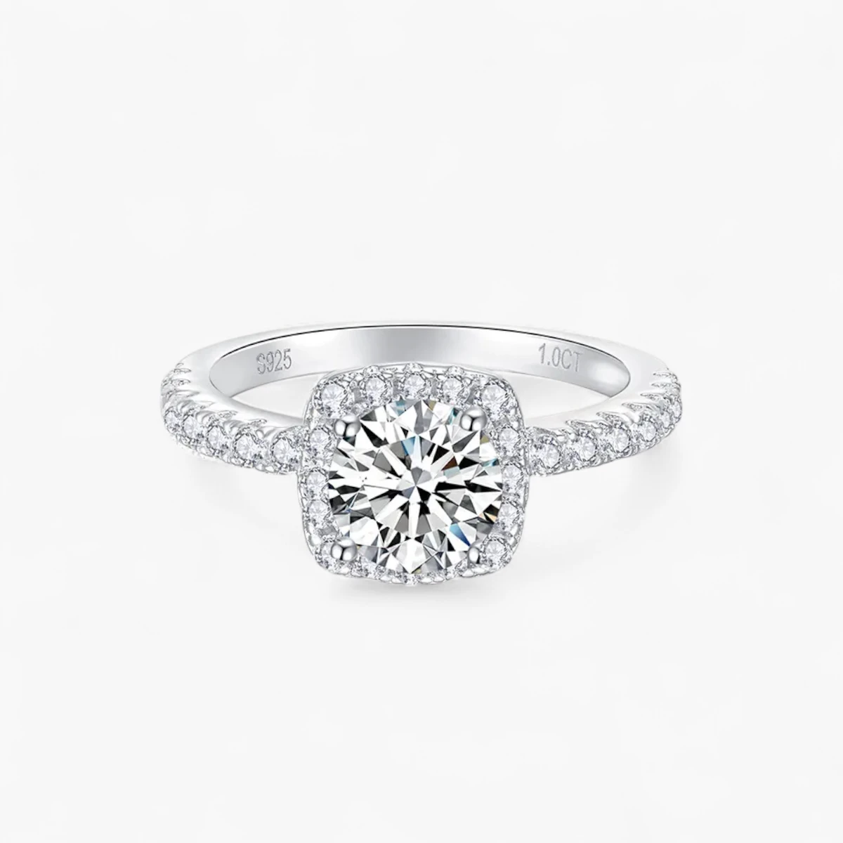 Available in 1ct, 2ct, and 3ct options, this Cushion Halo Round Center Moissanite Ring features a brilliant round center moissanite encircled by a halo of sparkling small moissanites in a timeless cushion shape. The dazzling halo enhances the center stone’s radiance, while the delicate side stones on the band create a harmonious blend of elegance and modern style.
