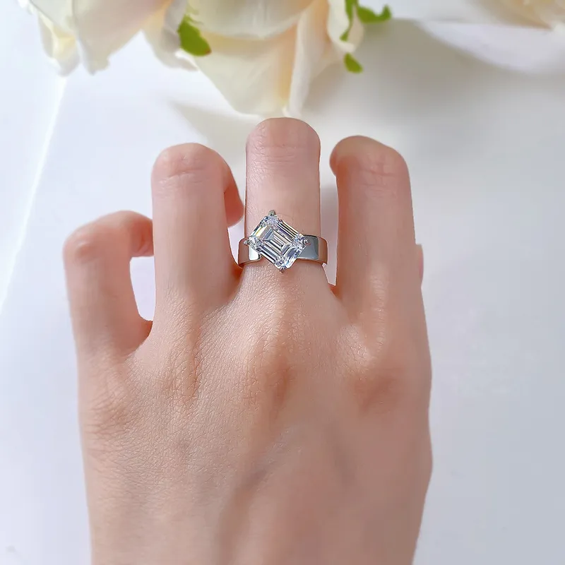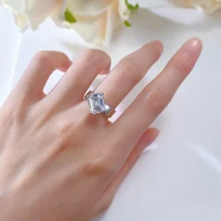 This 1ct Emerald Cut Moissanite Open End Solitaire Ring is crafted from sterling silver, offering a minimalist yet unique design. The centerpiece features a 1ct emerald-cut moissanite, with its clean lines and modern aesthetic. The open-end design adds flexibility, making it suitable for different finger sizes. The band is approximately 3mm wide, providing a comfortable fit without being too bulky or heavy. Available in six different color options, this ring is perfect for various styles, showcasing the wearer’s individuality and refined taste.