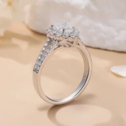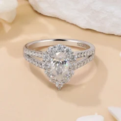 This pear-shaped moissanite ring features a stunning halo design, with a circle of sparkling side stones surrounding the main stone, creating a refined and elegant look. The split shank band is adorned with small moissanites along the branches, which naturally converge into a sleek metal section after a short distance, giving the ring a modern and minimalist touch. A perfect blend of classic and contemporary design, this ring is ideal for any special occasion, making it the perfect choice to symbolize love and commitment.