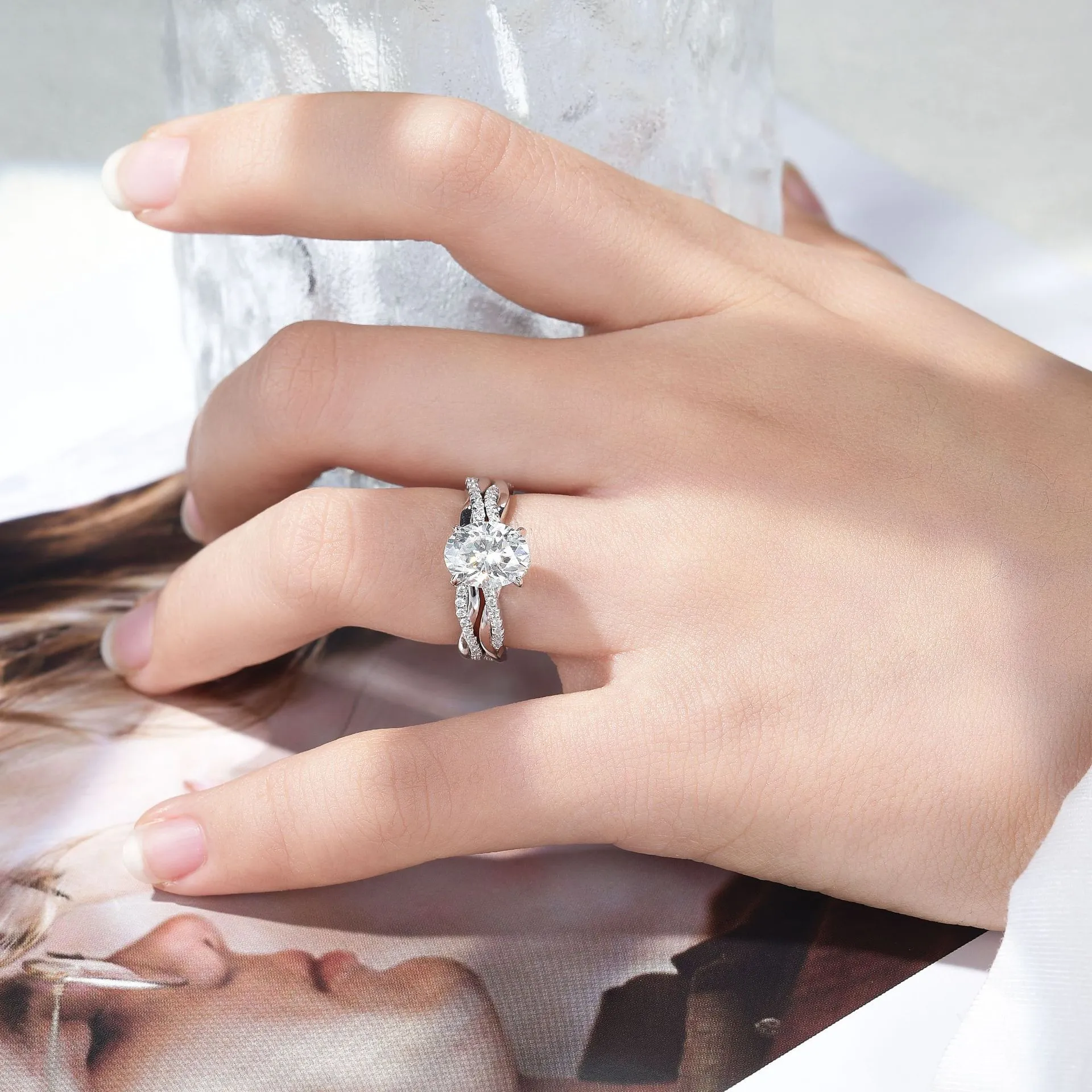 This 2ct oval-cut moissanite twist sterling silver ring features a stunning 2-carat oval-cut moissanite as the center stone, complemented by 18 sparkling moissanite side stones. With its elegant twisted design, this ring offers a distinctive modern look, perfect for wearing solo or stacking with a plain twisted band for a chic style.