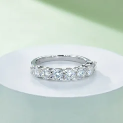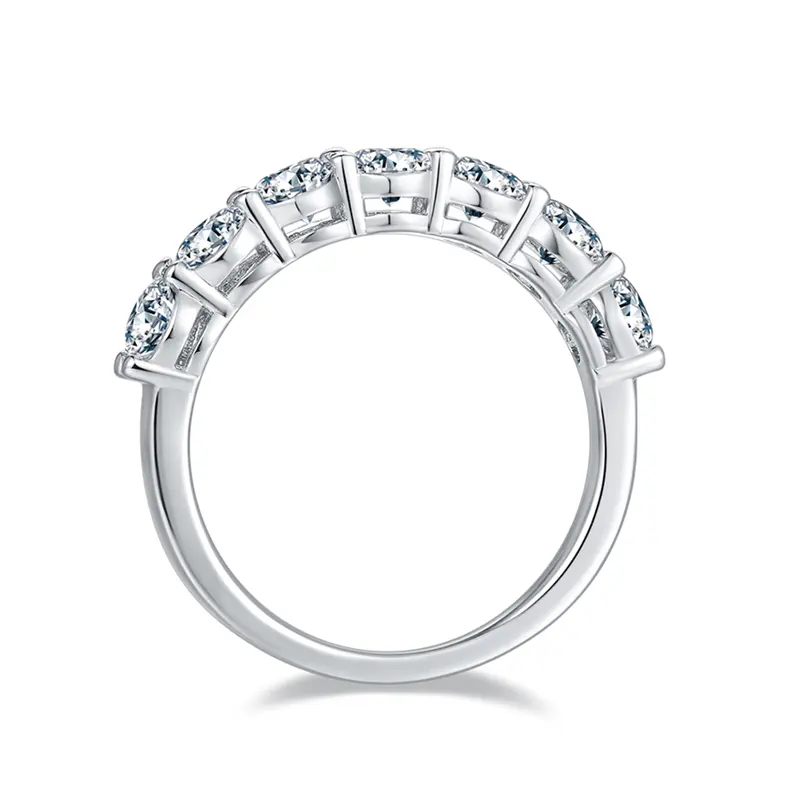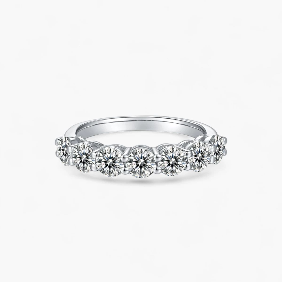 This round half eternity ring showcases seven radiant moissanite stones with a total weight of 2.1ct, set in gleaming sterling silver. The classic round-cut stones offer timeless elegance and a touch of sparkle that complements any style.