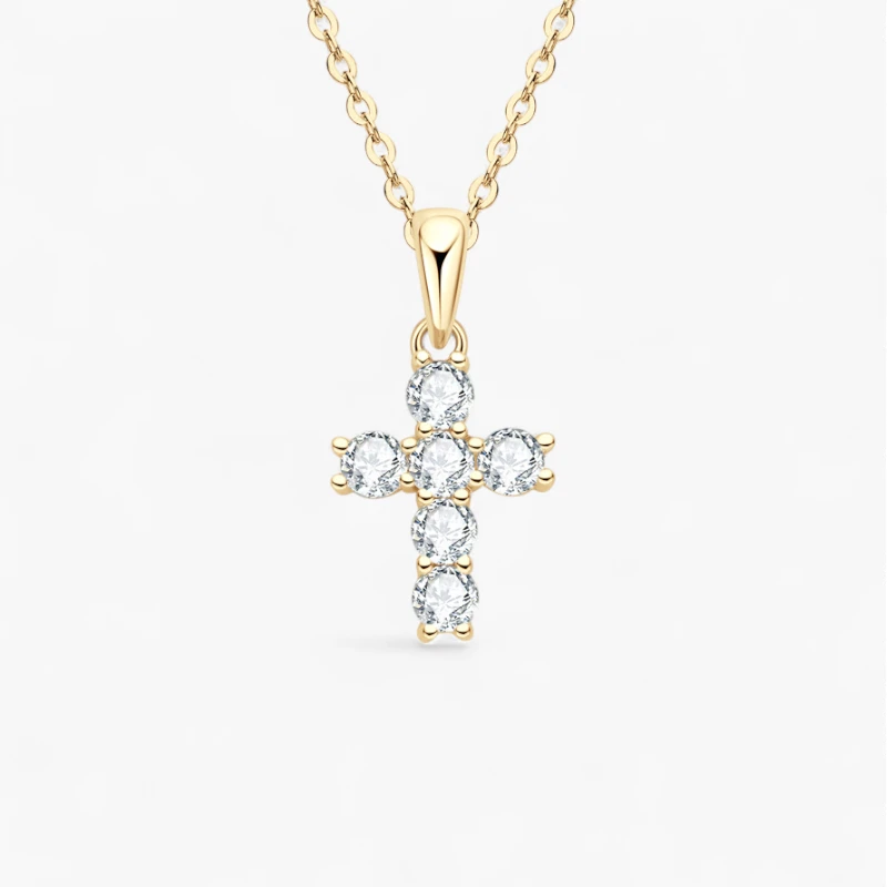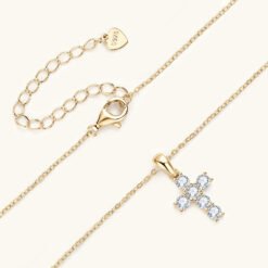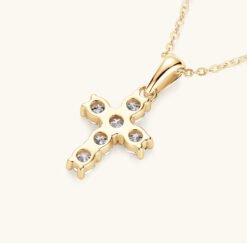 This 3mm moissanite cross necklace features six sparkling moissanite stones, beautifully set in a timeless cross design. Made of sterling silver with a luxurious gold plating, it combines classic elegance with modern brilliance. Perfect for everyday wear or as a meaningful gift, this necklace symbolizes faith, love, and light.