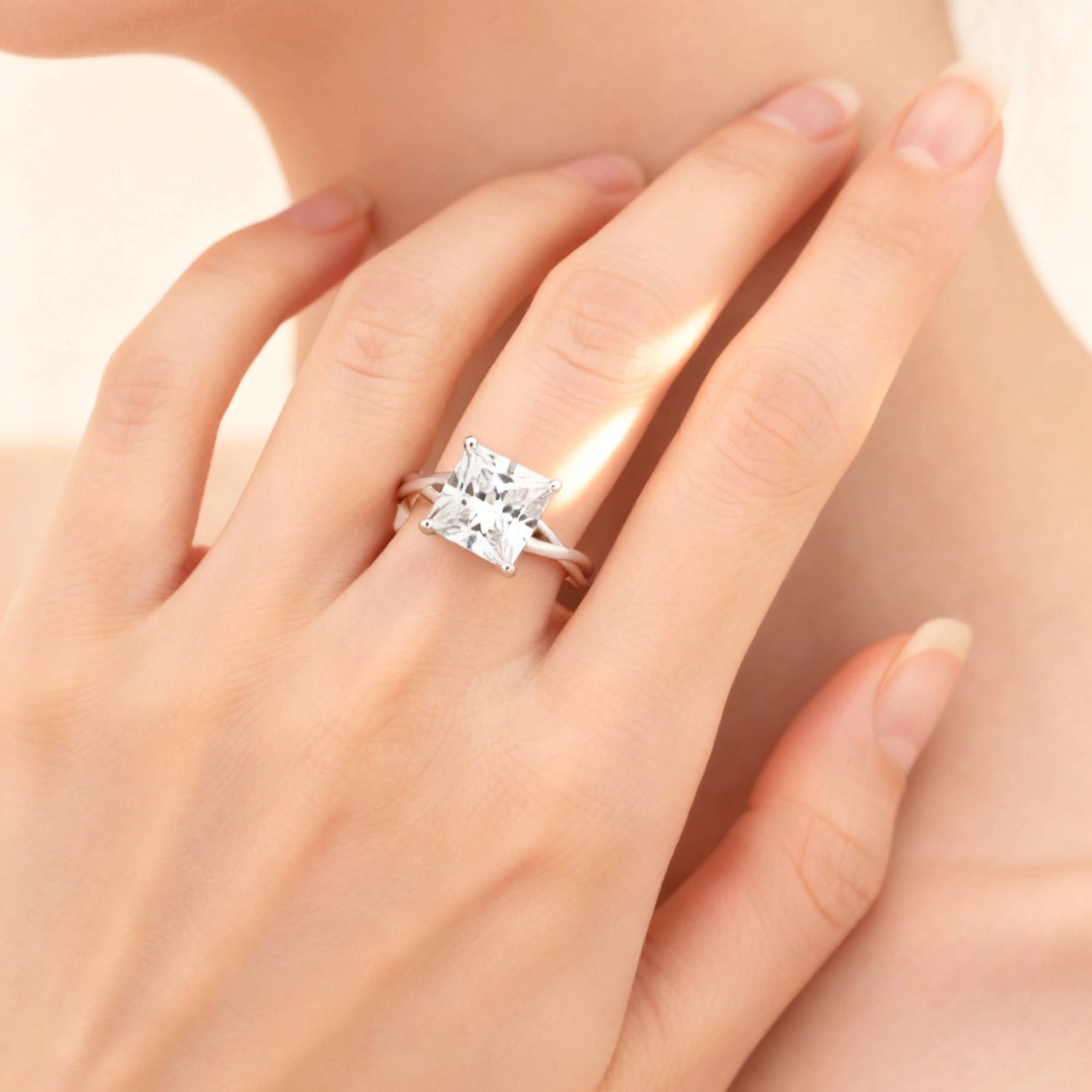 This 4ct princess cut moissanite twist solitaire ring showcases a minimalist yet elegant design. At its center lies a brilliant 4ct princess-cut moissanite stone, sparkling with the brilliance of a diamond. The twist band design adds movement and a modern touch, with unique curves and light interplay, creating an artistic and distinctive charm. Made from high-quality sterling silver, the exquisite craftsmanship and fine polishing make the ring even more dazzling. Whether for a wedding, anniversary, or everyday wear, this ring is the perfect symbol of love and commitment.