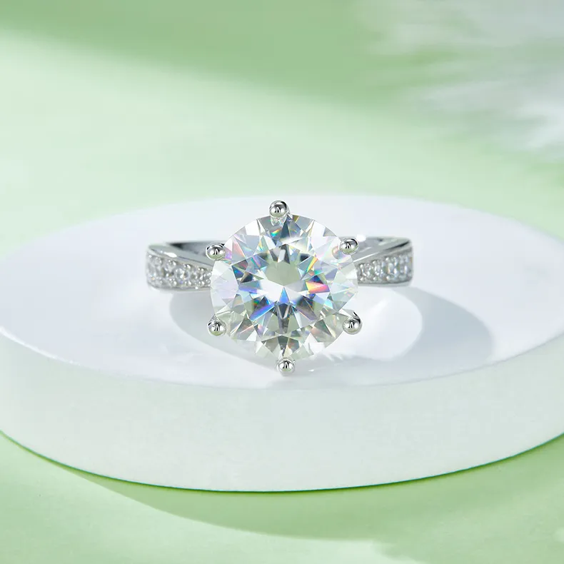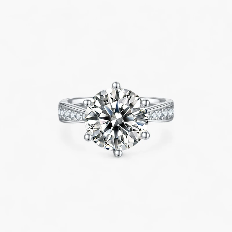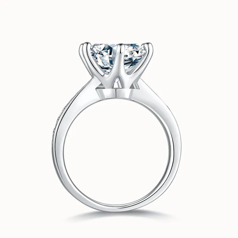 Get ready to turn heads with this dazzling 5-carat round moissanite ring! Featuring a classic 6-prong setting, this piece showcases the brilliance of the main stone while 14 accent stones line the sterling silver band, adding just the right touch of extra sparkle. The band measures 2.5mm wide, striking the perfect balance between sturdy and sleek. Whether you’re dressing up for a special occasion or just want to add some shine to your everyday look, this ring is here to bring on the sparkle without the fuss. It’s a timeless choice for anyone who loves a bit of glam with their silver.