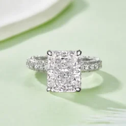 Experience the ultimate in luxury and sophistication with this breathtaking 5ct radiant cut moissanite ring. The centerpiece, a magnificent radiant cut moissanite, shimmers with an intense brilliance, rivaling even the finest diamonds. Accentuated by a pave setting of exquisite side stones, this ring is a true masterpiece of light and sparkle. The unique radiant cut enhances the gem’s natural fire, creating a mesmerizing play of light from every angle. Crafted with precision and passion, this ring is a symbol of timeless elegance and refined taste. Make a statement and embrace your inner radiance with this extraordinary piece of jewelry.