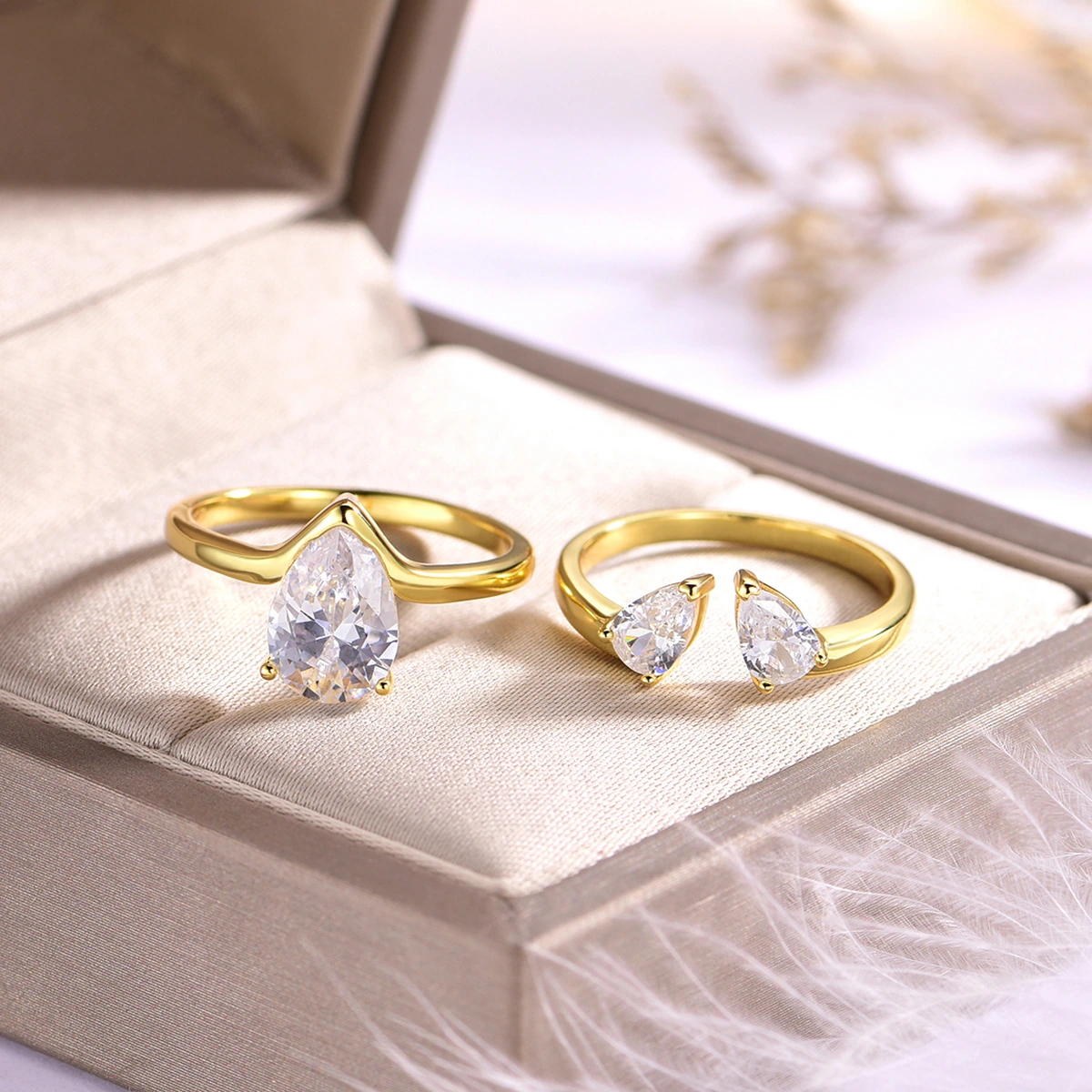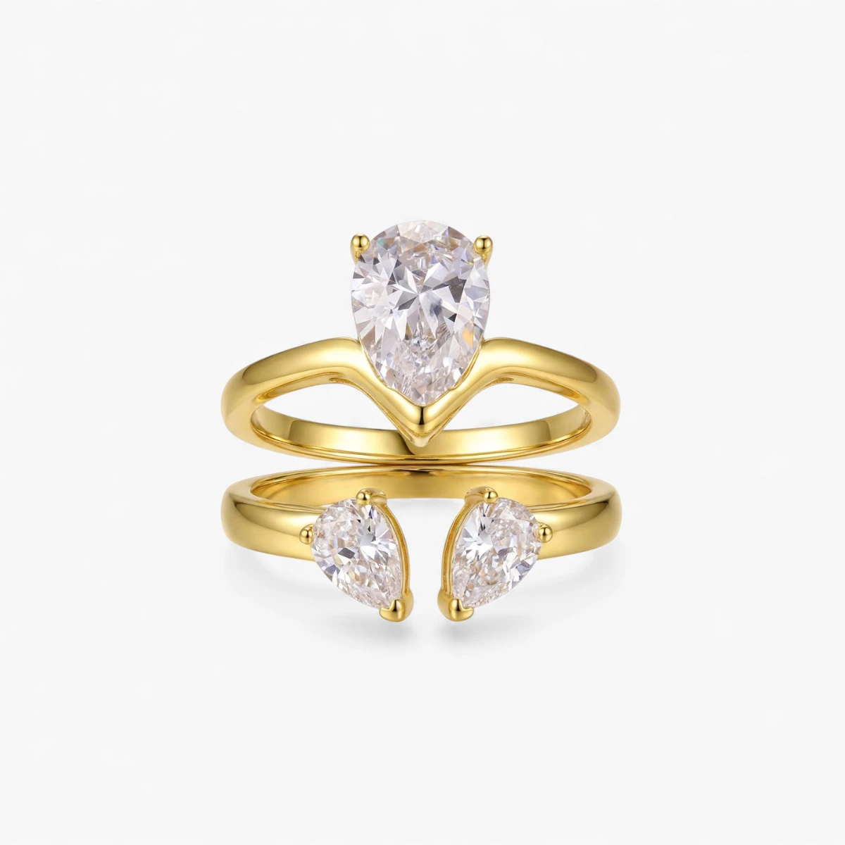 A story in two parts, designed to become one. The solitaire ring, with its brilliant pear-cut centerpiece, nests perfectly within the gentle curve of its companion. This contoured band, itself adorned with two delicate teardrops of light, completes the embrace. Worn together, they form a radiant trilogy—a symbol of a love that is whole on its own, yet magnified in union.