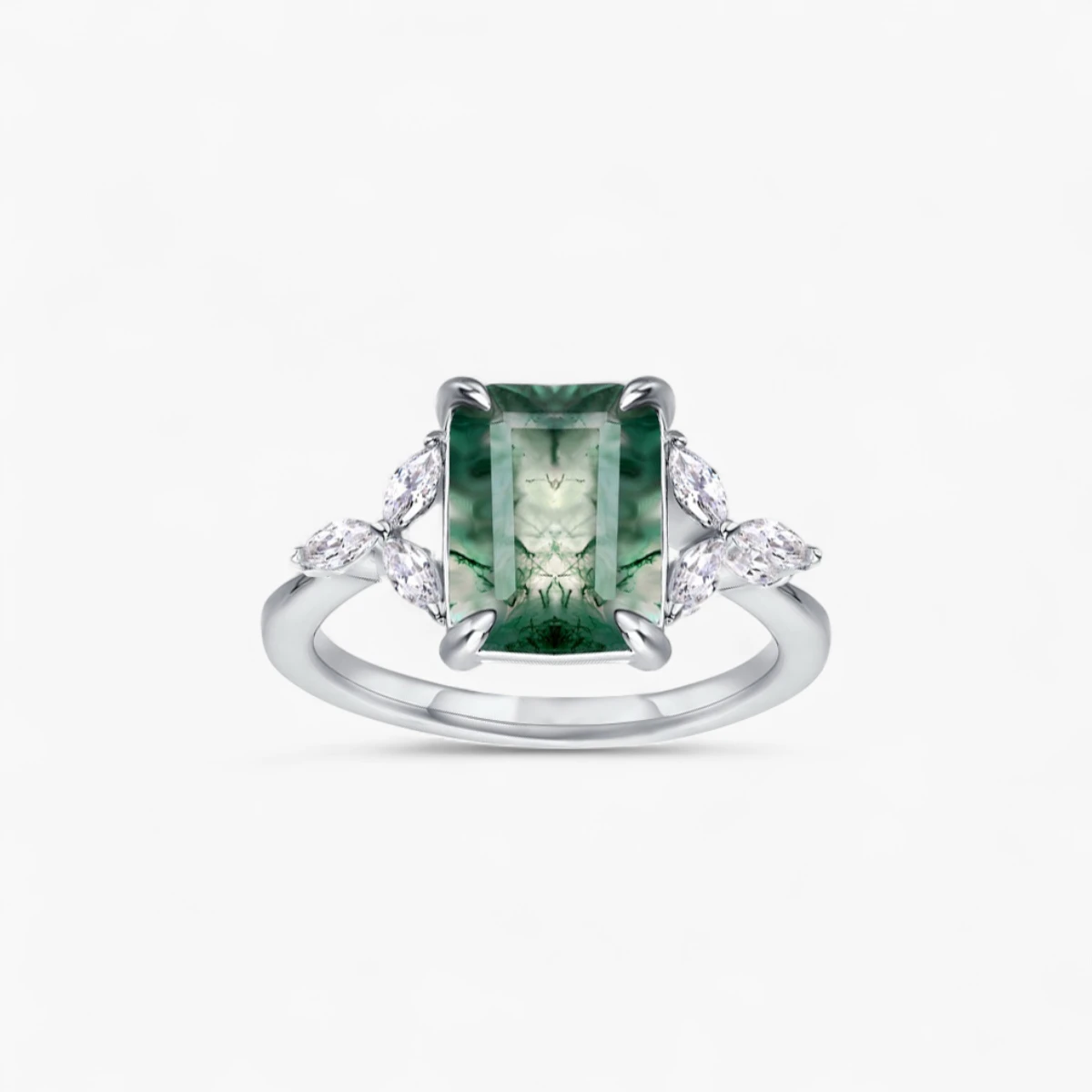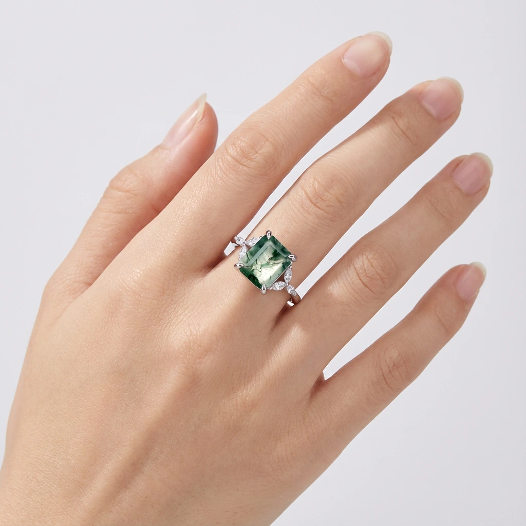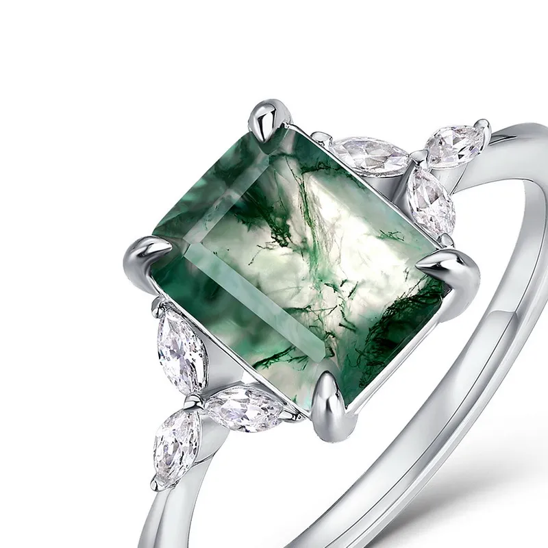 Step up your style game with this stunning 3ct emerald-cut moss agate silver ring! It’s more than just a pretty bauble; it’s a statement that whispers ‘unique’ and ‘elegant’ all at once. Imagine the earth’s verdant secrets encapsulated in this lush green stone, every twist and turn of the moss pattern telling a tale of nature’s serenity. Crafted with love in sterling silver, it’s a ring that adds a touch of whimsy to every outfit, making you feel like a walking work of art. Whether you’re dressing up for a special occasion or keeping it casual, this ring is the perfect accessory to elevate your look.