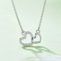 The exquisite silver “Heart to Heart” moissanite necklace features two heart-shaped pendants that closely embrace each other, each adorned with countless sparkling moissanites that shine like the brightest stars in the night sky.The silver chain perfectly complements the heart pendants, creating a design that is both simple and elegant. Whether for everyday wear or special occasions, this necklace will ensure you stand out and showcase your unique charm and romantic spirit.