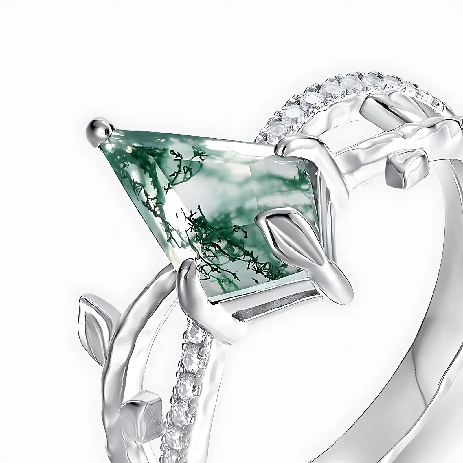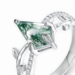 This irregular diamond-shaped moss agate gem silver ring stands out with its unique design and style. Crafted from high-quality silver, the ring exudes an elegant and sophisticated glow. The ring face is embedded with an irregularly shaped moss agate gemstone, featuring naturally formed textures within. Each pattern is unique, as if capturing the exquisite craftsmanship of nature on your fingertips. This ring is not only a fashionable accessory but also a jewelry piece filled with natural charm and artistic sensibility. It is suitable for various occasions, highlighting the wearer’s unique taste and personal charm.