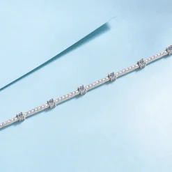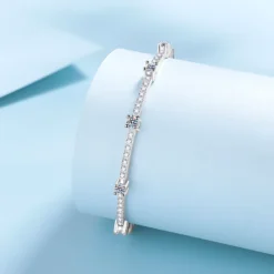 Moissanite silver bracelet with simple lines outlines endless delicacy. The silver chain is as smooth as a wave, gently wrapping around the wrist, glittering with a cold and charming luster. The moissanite inlaid in between is crystal clear and dazzling like the brightest star in the night sky. Every gentle swing seems to speak of low-key luxury and extraordinary taste. This is a suitable accessory for any occasion, which can show off your style and add a touch of elegance.