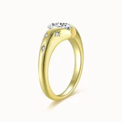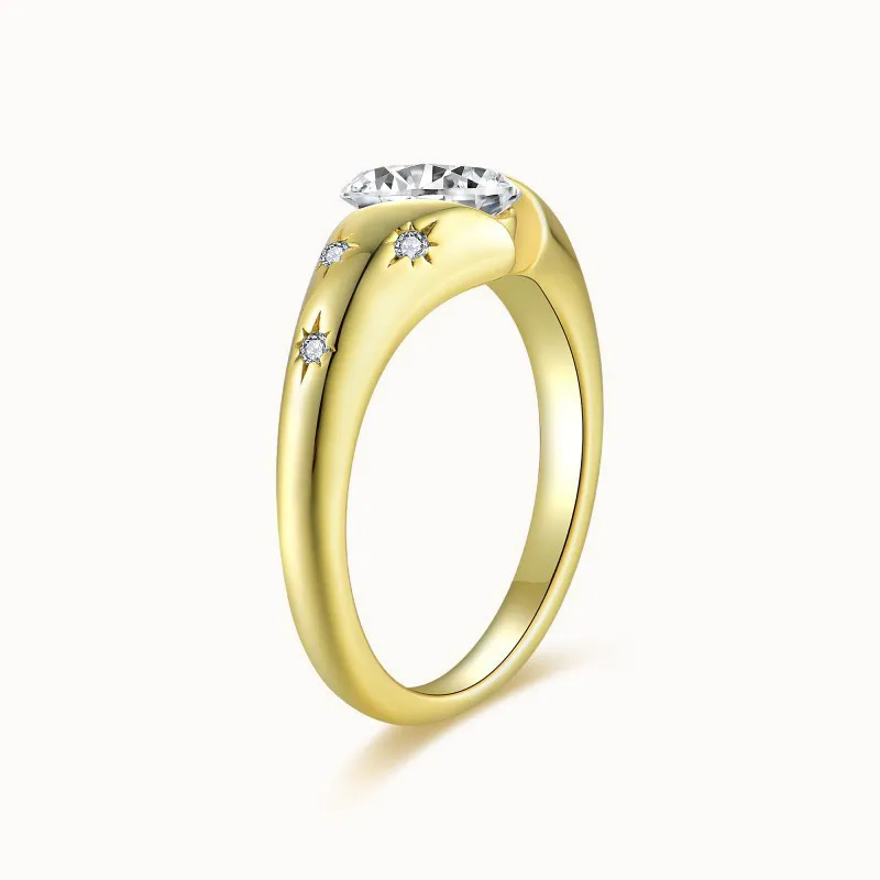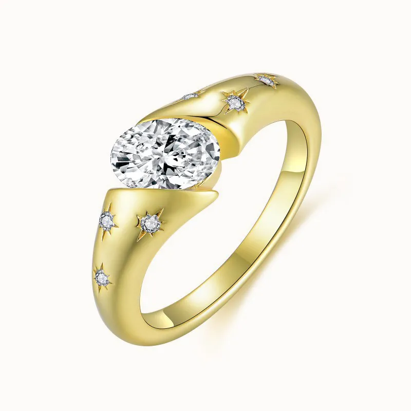 This elegant ring features a gold-plated sterling silver base, set with a radiant oval-cut Moissanite as its centerpiece, showcasing a remarkable clarity and sparkle. Surrounding the main stone are carefully placed smaller Moissanites, creating a dazzling, multidimensional brilliance. The ring’s unique design includes a central groove that enhances the stone’s allure, giving the piece a refined, luxurious look. With its exquisite details and regal style, this ring embodies sophistication and is sure to make a statement.