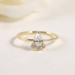 This delicate and intricate pear-cut moissanite cluster ring features a sterling silver base plated with 14K gold, beautifully showcasing a sophisticated and refined design. Each moissanite stone is meticulously cut, and the delicate pear shape and cluster design make this ring both modern and elegant. It’s perfect for everyday wear or special occasions. The 14K gold plating process not only enhances the ring’s shine but also provides better durability, preventing color fading.