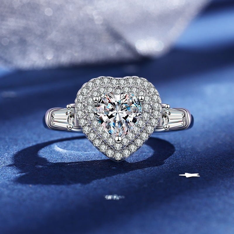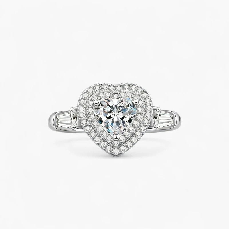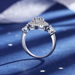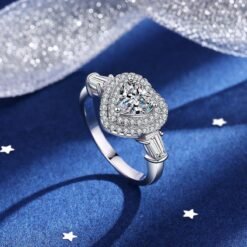 This is a love ring with a 1ct heart shaped moissanite in the center and 2 circles of zirconia on the outside, the luxurious design is perfect for your love gift. Give it to your beloved on your anniversary or Valentine’s Day!