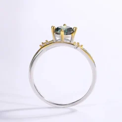 This exquisite two-tone moissanite ring features a stunning large round moissanite at its center, surrounded by a cluster of tiny transparent stones, reminiscent of stars gathered around the moon, radiating enchanting brilliance. The side of the ring showcases three small round Moissanites, each meticulously set in slender metal bands, adding a touch of elegance and luxury. The perfect combination of gold and silver gives the ring a timeless yet fashionable appeal. Set against a pure white background, this ring truly stands out, making it a captivating choice for everyday wear or as a statement piece for special occasions, allowing you to exude unique charm and brilliance.