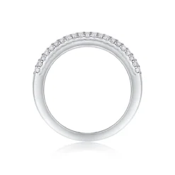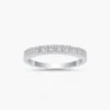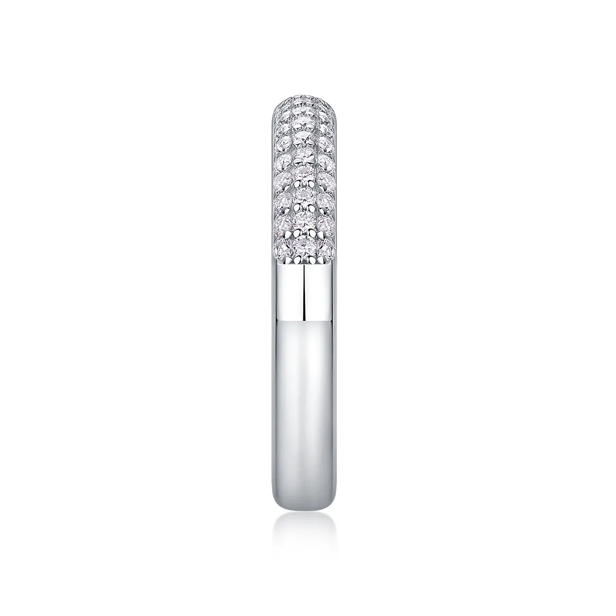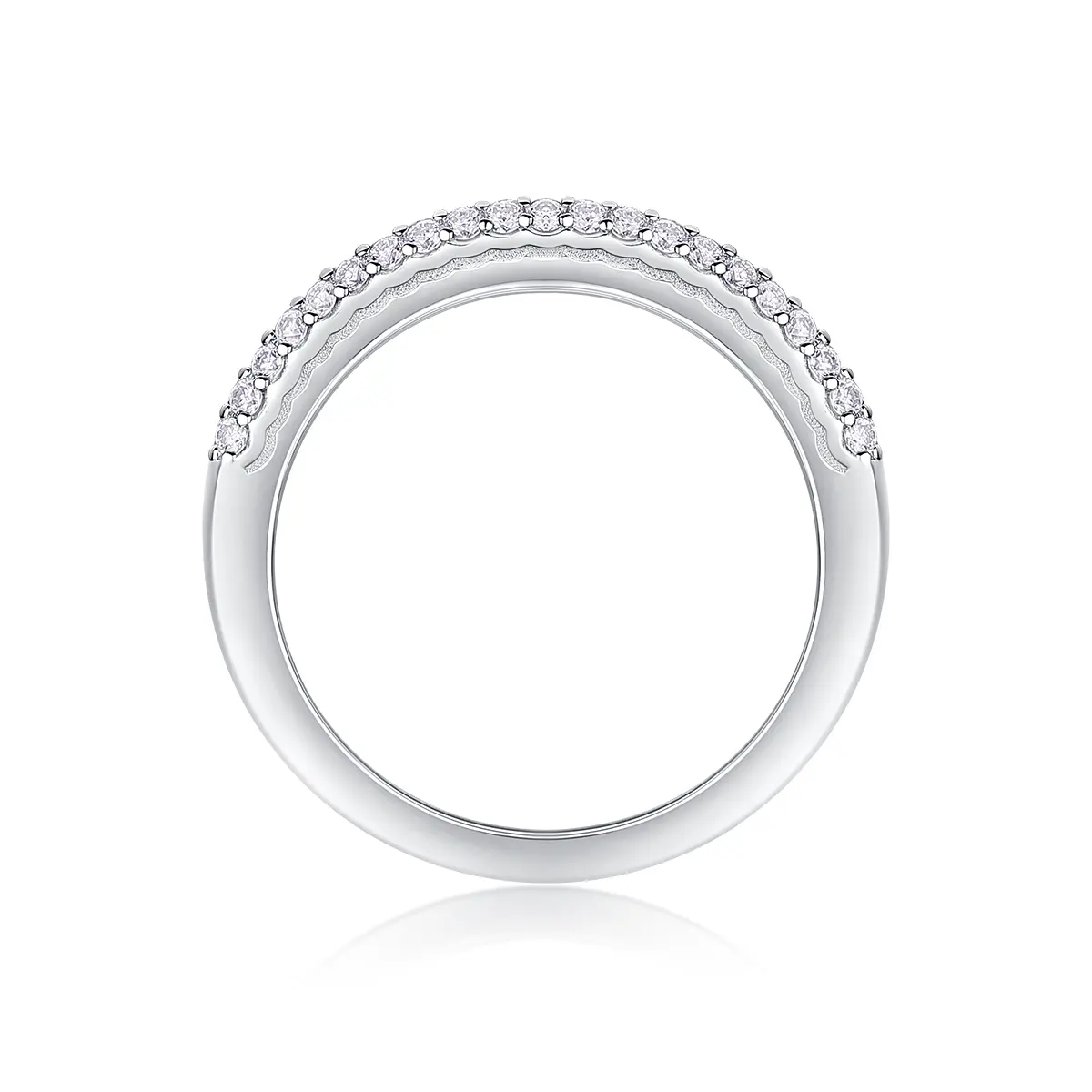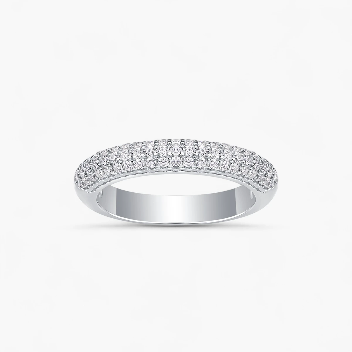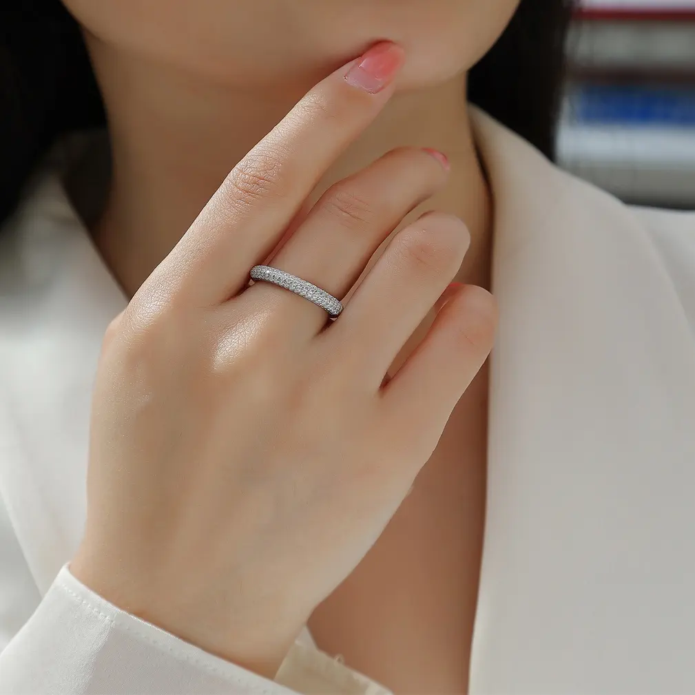 This sterling silver half-eternity band showcases 30 moissanite stones arranged in three elegant rows. The minimalist design offers a refined sparkle, perfect for adding a touch of sophistication to any look. Ideal for both daily wear and special moments.