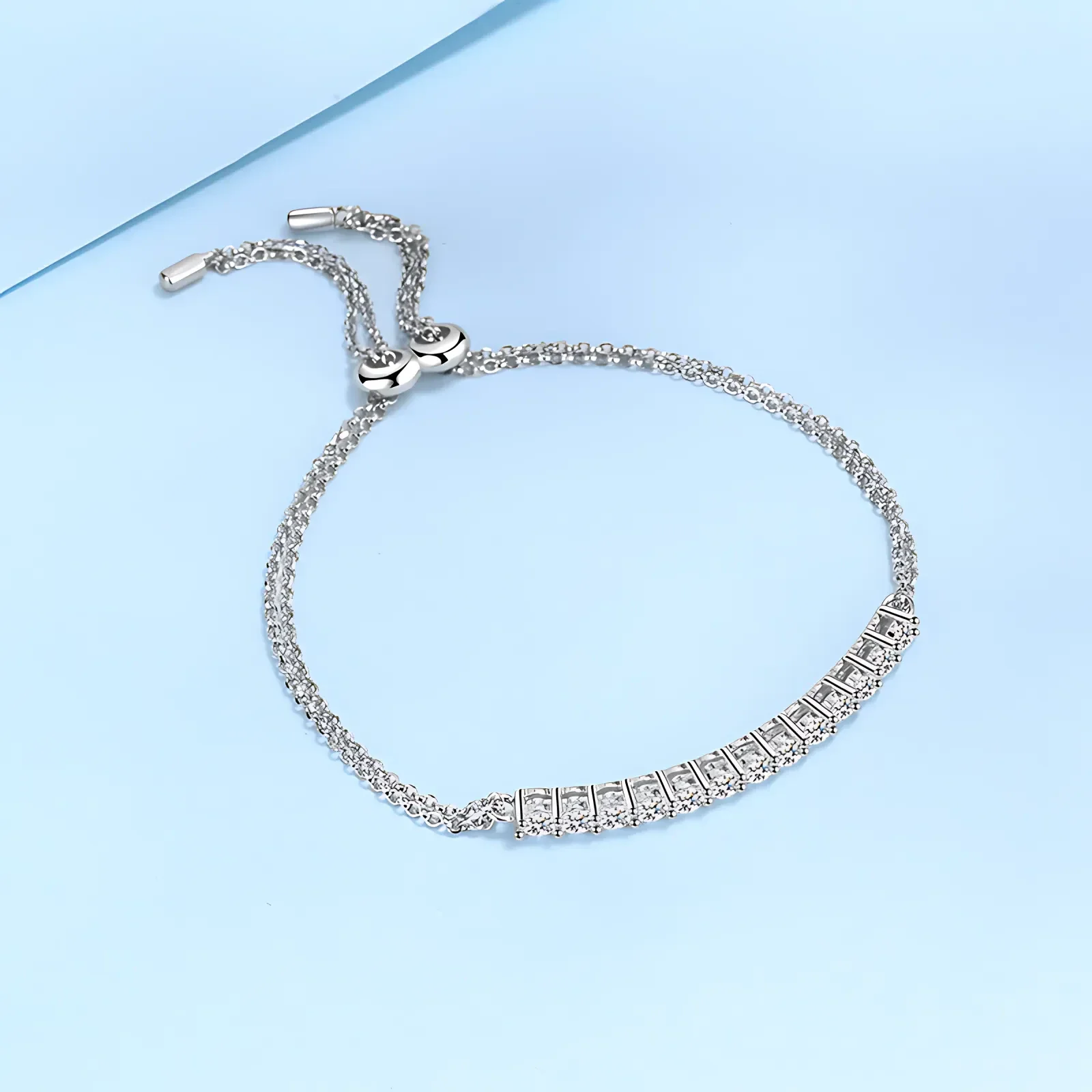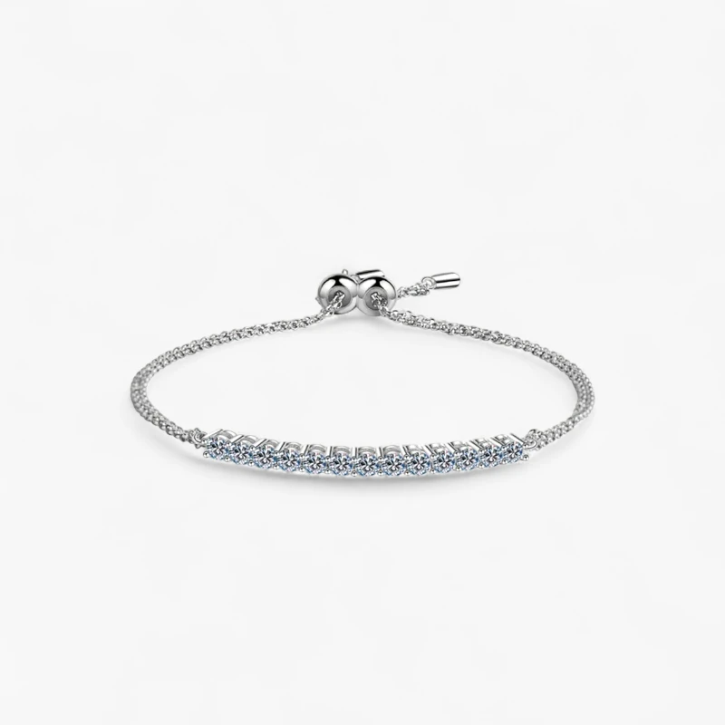 Enhance your casual or formal attire with a subtle yet captivating sparkle from this bolo bracelet. Adorned with 13 moissanite stones, it offers a breathtaking display of elegance. The bracelet boasts convenient sliding clasps that seamlessly adjust to fit your wrist perfectly, ensuring your bling remains securely in place. Whether dressed up for a special occasion or down for casual wear, this bolo bracelet remains an elegant and timeless choice.