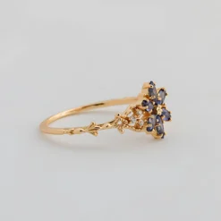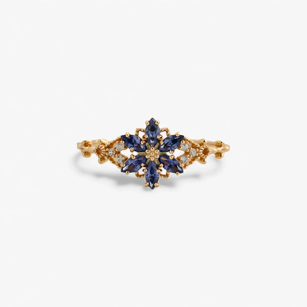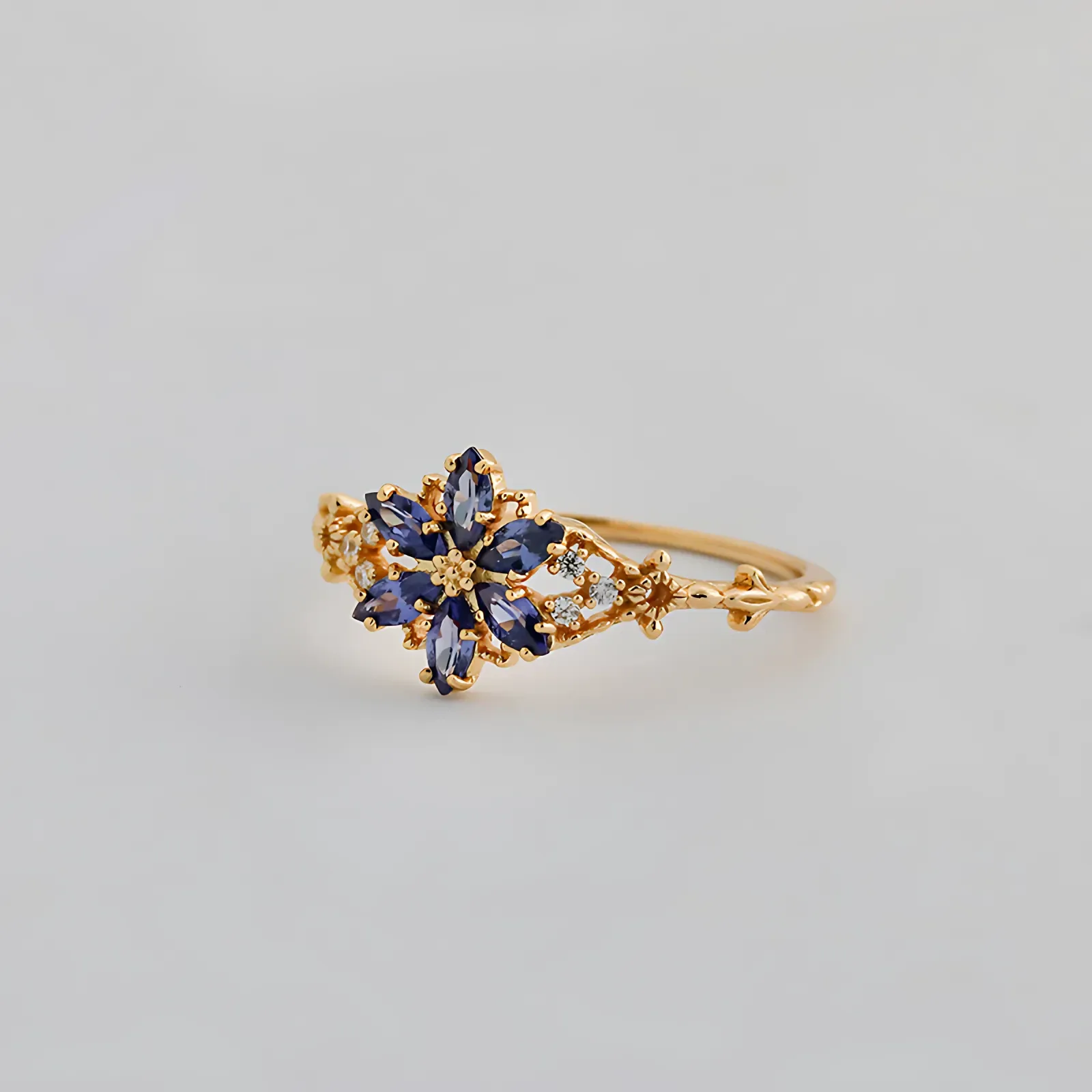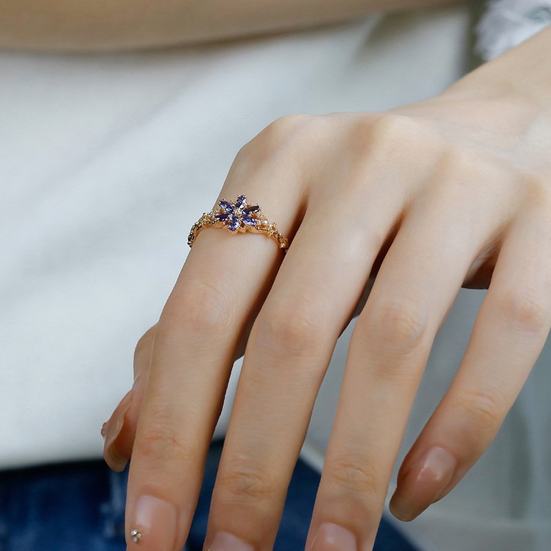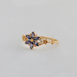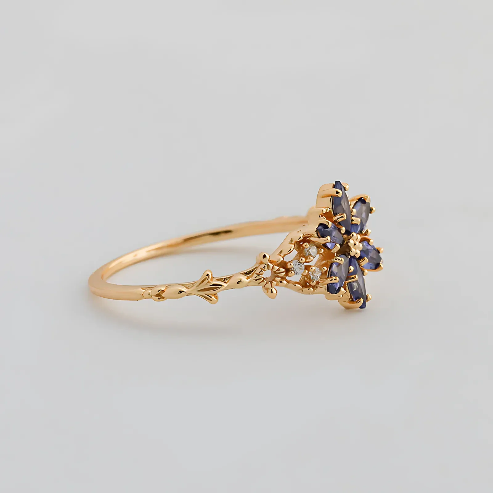 Adorned with a deep purple tanzanite, this ring captures the essence of romantic floral design. Crafted in sterling silver with a gold plating, it exudes vintage charm and timeless elegance.