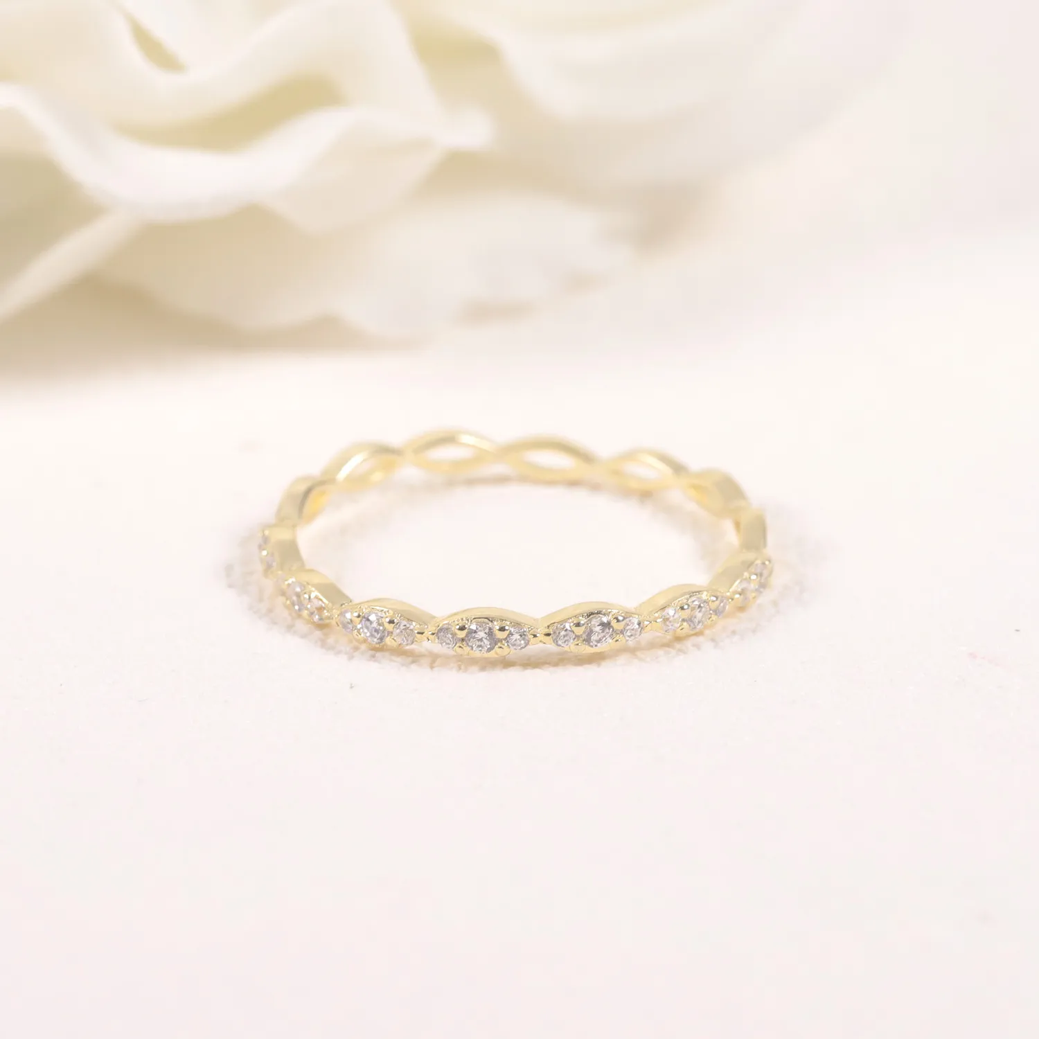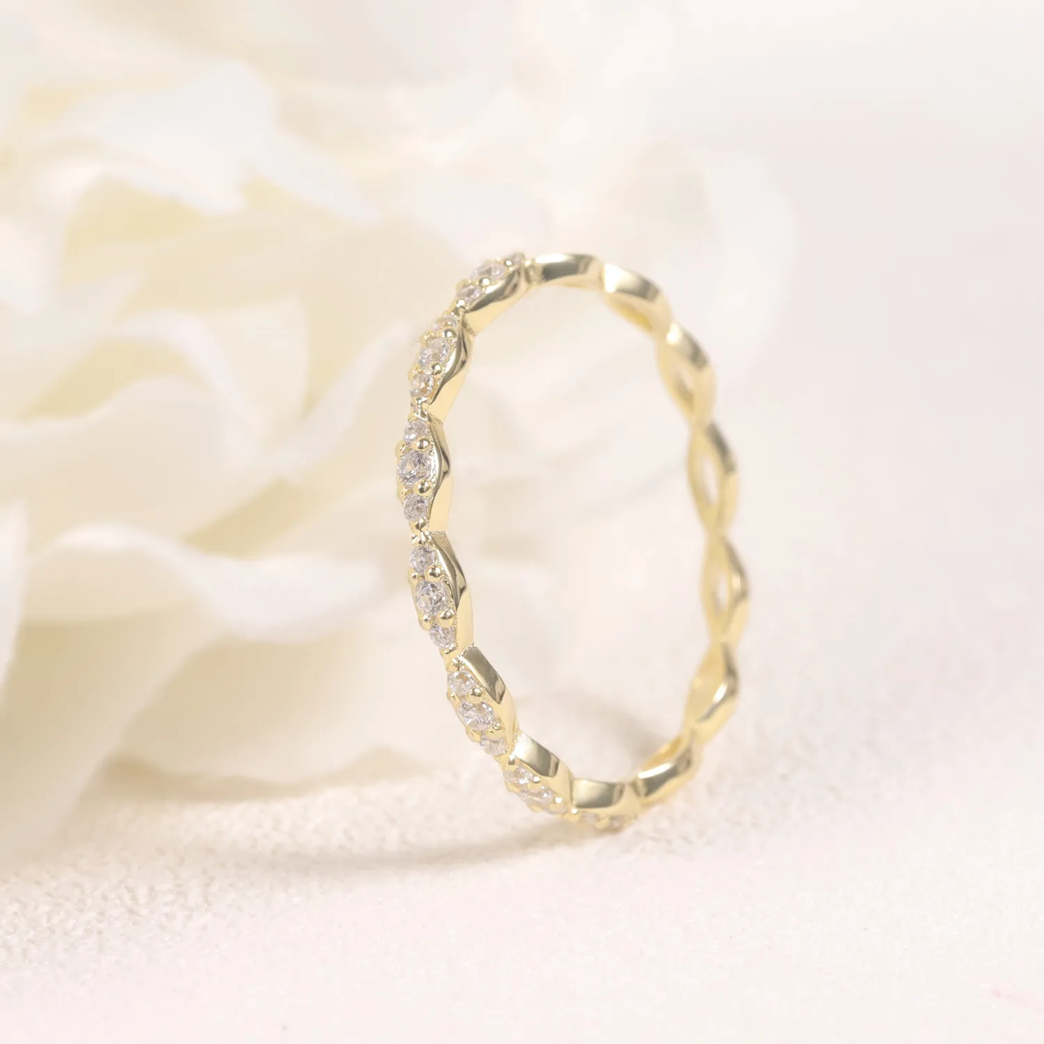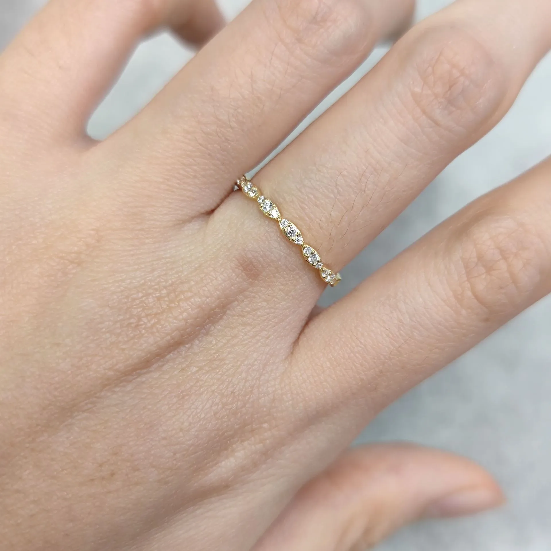 This ring features a unique pointed design, with sharp ends and a slightly wider center, where three sparkling moissanite stones is set. The design is inspired by modern minimalist style, with the pointed connection symbolizing strength and commitment, while the central Moissanite adds a brilliant touch of sparkle. The overall shape flows seamlessly, resembling a delicate line that connects the ends to form a perfect circle. Whether worn alone or stacked with other pieces, this ring adds a distinctive charm to your hand, highlighting your independent and confident personality.