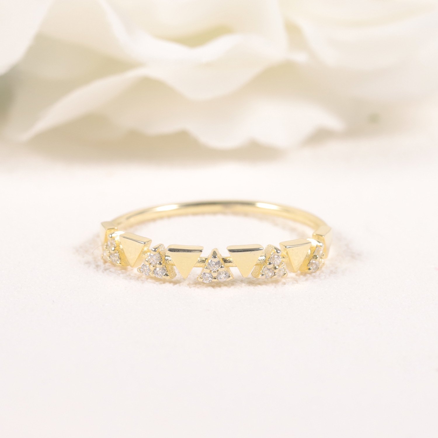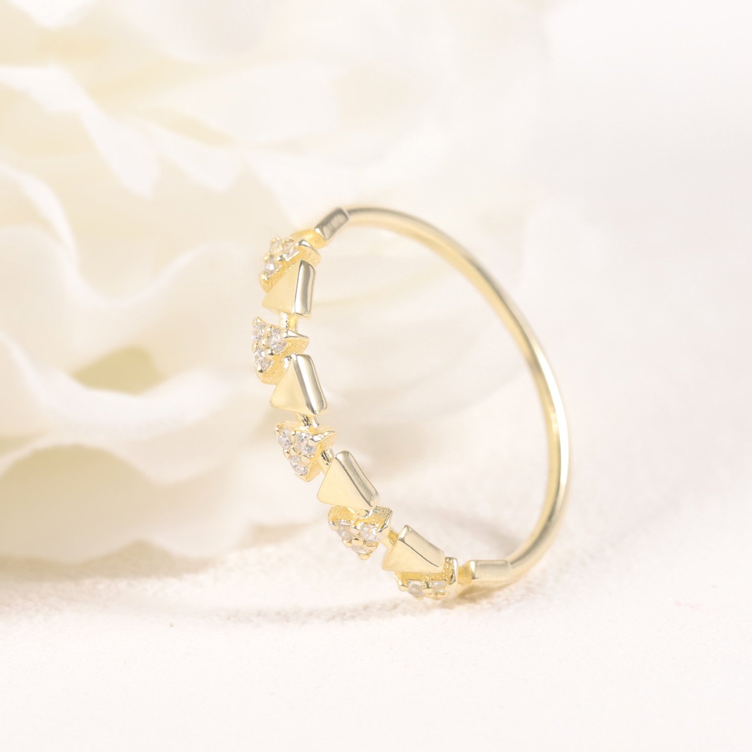 This ring features a triangular metal design, carefully set with several dazzling moissanite stones, offering a sleek and modern aesthetic. Each moissanite stone perfectly complements the metal, adding unique brilliance to the ring. The triangular shape symbolizes stability and balance, much like an eternal promise, while the refined craftsmanship enhances its appeal. Whether worn alone or paired with other jewelry, it adds a touch of striking sparkle to your look, highlighting the elegance and confidence of the modern woman.