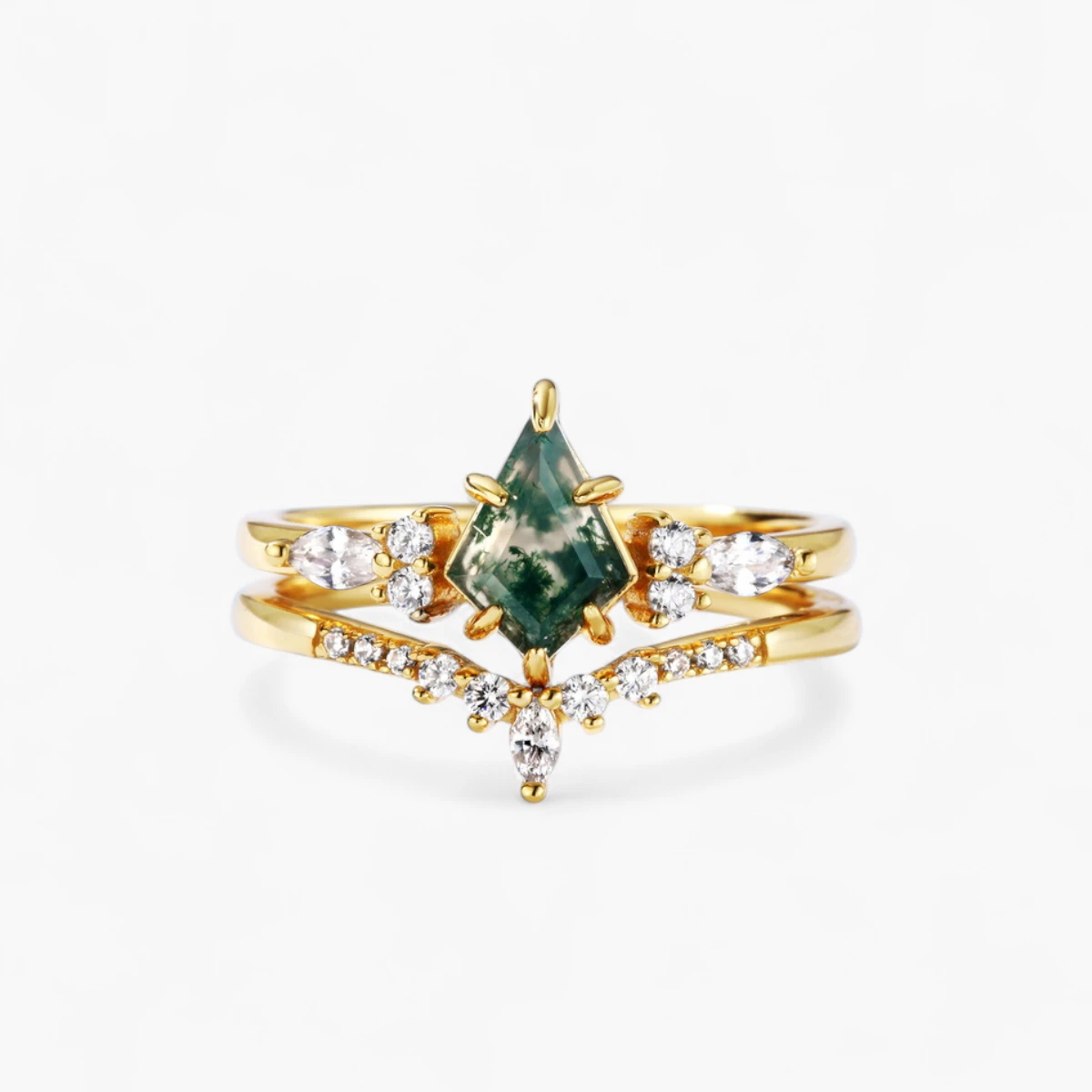 Retro charm collides with moss agate in this stacking ring set, offering a dual-tone appeal! Crafted from pure silver in silver and gold tones, it maintains the purity of metal while exhibiting a distinct layered look. Each ring showcases a carefully selected moss agate with a warm luster. The stacking design gives you freedom to create your own style. Wear them individually or stacked up for added depth, exuding a captivating retro allure. This ring set is a stylish declaration of your individuality and personality!